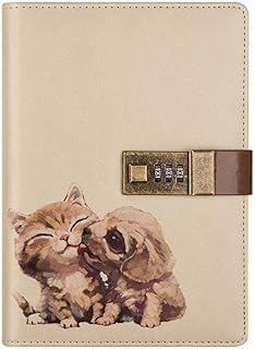 Voyage Portable avec serrure à combinaison, journal d'écriture Cuir PU animaux Journal bloc-notes avec stylo support pour filles et garçons, rechargeables A5 Planner, 112 Feuilles Cat&Dog