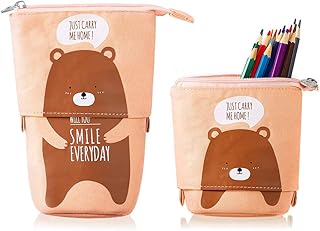 Trousse à Crayons, HOMEK Télescopique Sac à Crayons en Toile Étui à Crayons de Dessin Animé Ours Mignon Trousse de Maquillage avec Fermeture Éclair pour Étudiant Fille L'école Bureau, Orange