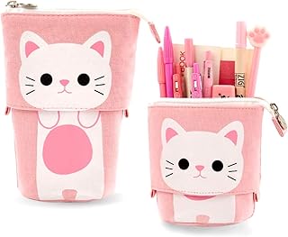 Trousse à Crayons, HOMEK Télescopique Sac à Crayons en Toile Étui à Crayons de Dessin Animé Chat Mignon Trousse de Maquillage avec Fermeture Éclair pour Étudiant Fille L'école Bureau, Rose