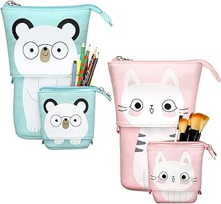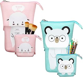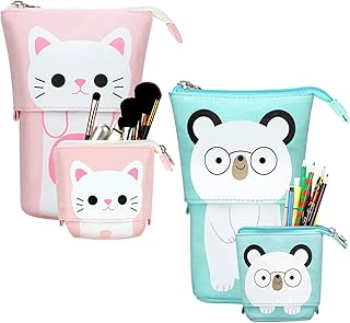 2 Pcs Porte-Crayon Support de Transformateur Organisateur de Crayon Télescopique Sac Toile PU Dessin Animé Trousse de Maquillage Cosmétique avec Fermeture Éclair (Ours Blanc et Chat Rose)
