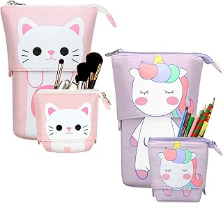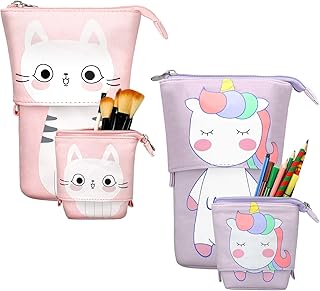 2 Pcs Porte-Crayon Support de Transformateur Organisateur de Crayon Télescopique Sac Toile PU Dessin Animé Trousse de Maquillage Cosmétique avec Fermeture Éclair (Chat Rose et Licorne)
